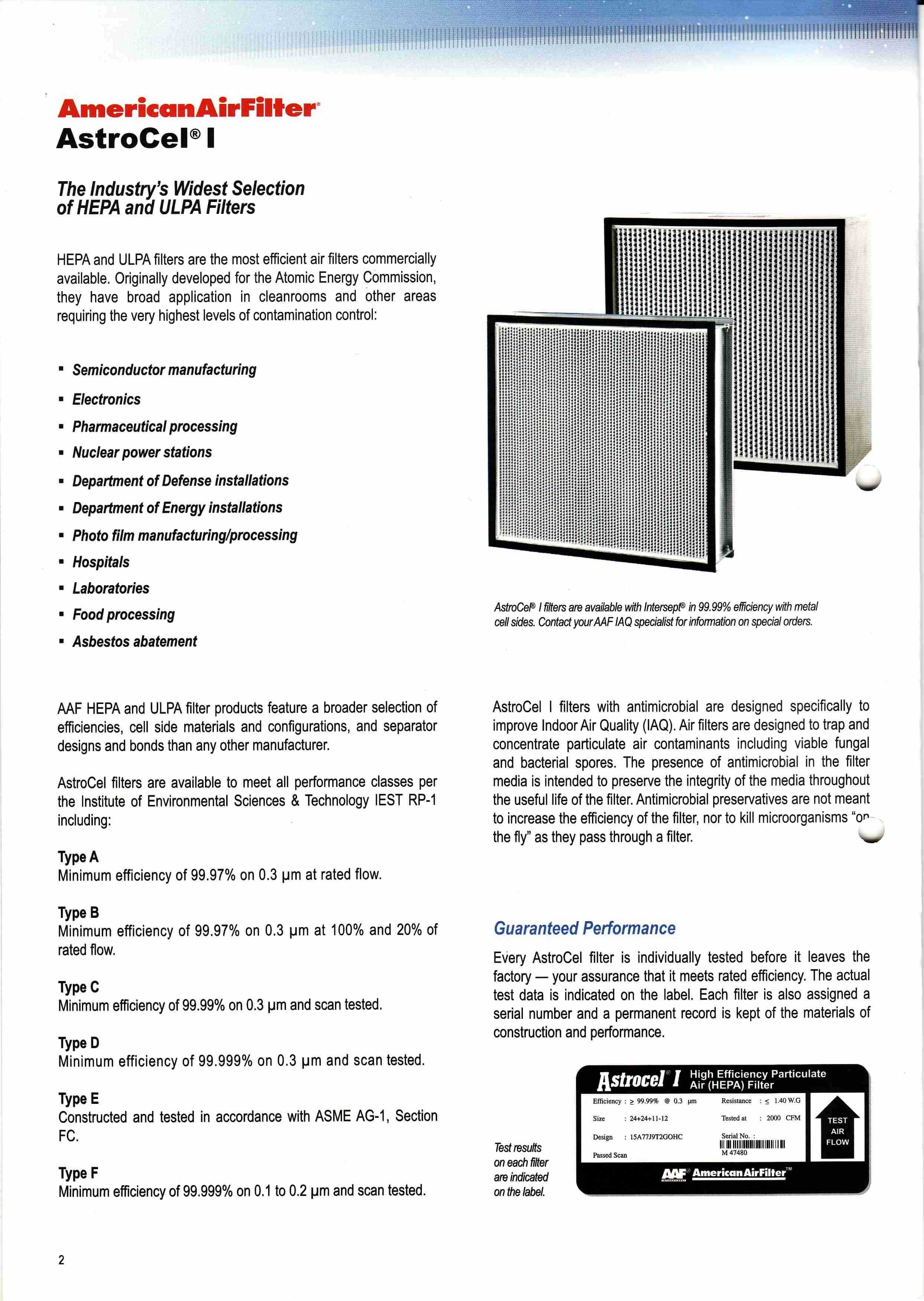High Efficiency Particulate Air Filters (HEPA) Ultra Low Penetration Air Filter (ULPA)